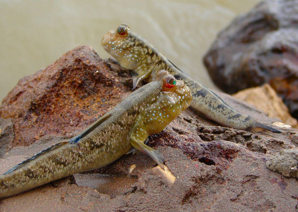 The most interesting trait of the mudskipper is their ability to both survive and thrive in and out of water. When leaving the water and moving into a drier environment on land they are still able to breathe using water that is trapped inside their rather large gill chambers. They are also able to absorb oxygen from the lining of their mouth and throat allowing them to stay out of water for long periods of time. In fact, it has been discovered that they spend up to three quarters of their life on land. This fish has several other adaptive features that help it survive both on water and on land. The fish can move on land using its pectoral fins, which help it to hop around. The pelvic fins of the fish are useful for moving up roots or rocks, and the pectoral fins assist in pulling or pushing the fish high or low.